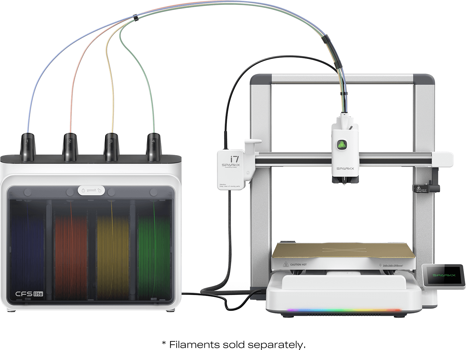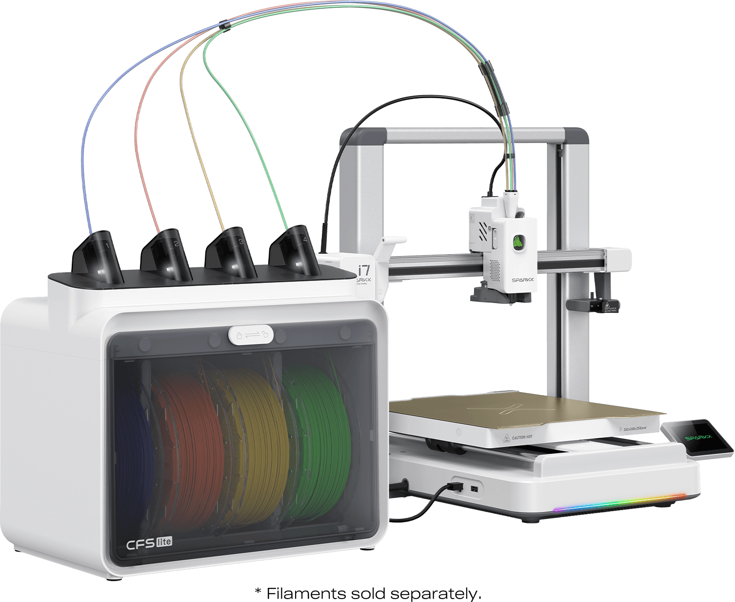 The Creality SPARKX i7 Combo is designed for convenient and efficient multicolour printing with up to four colours. In combination with the CFS Lite system, the printer enables an automated colour change, which not only saves time but also significantly reduces material consumption.
